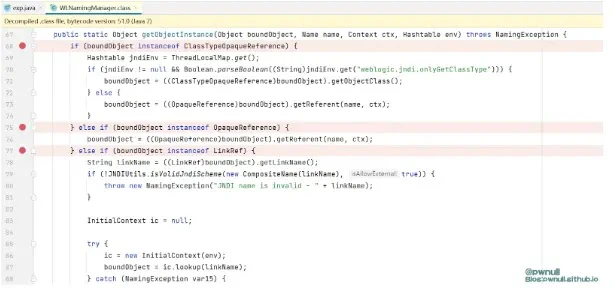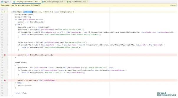 An attacker can exploit WebLogic’s JNDI functionality through two main methods. First, if the target class implements the OpaqueReference interface and WebLogic uses the ForeignOpaqueReference class, a malicious lookup operation can trigger JNDI injection via the getReferent method.