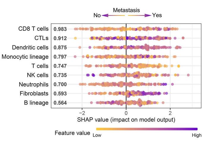 The core of the study lies in the application of XGBoost, a state-of-the-art gradient boosting algorithm, adept at managing structured clinical and biological data. The researchers meticulously assembled features including demographic and clinical parameters, immune cell infiltration data focusing on populations such as CD8⁺ T cells and cytotoxic T lymphocytes (CTLs), alongside cytokines such as transforming growth factor beta 1 (TGF-β1). This integrative approach enabled the development of a model that elucidates the contributory weight of each variable to metastatic risk and patient mortality in a transparent manner.