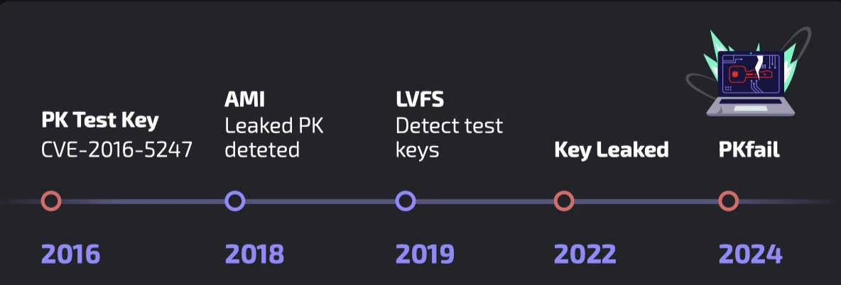 - Leaked Keys: Private keys from Intel Boot Guard and AMI were leaked, allowing attackers to bypass Secure Boot by manipulating the Key Exchange Key (KEK) database, the Signature Database (db), and the Forbidden Signature Database (dbx).
