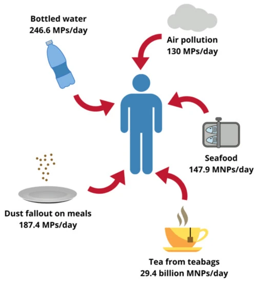 Erosion causes microscopic plastic particles to break away from the billions of tons of plastics in the environment that are exposed to the elements. These particles mix with our food and air, with an average person ingesting the equivalent amount as a credit card each week, according to Demokritou.