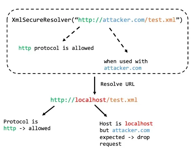 Though this setup seemed secure, it was later discovered that there was no HTTP request performed and a DTD processing exception was thrown.