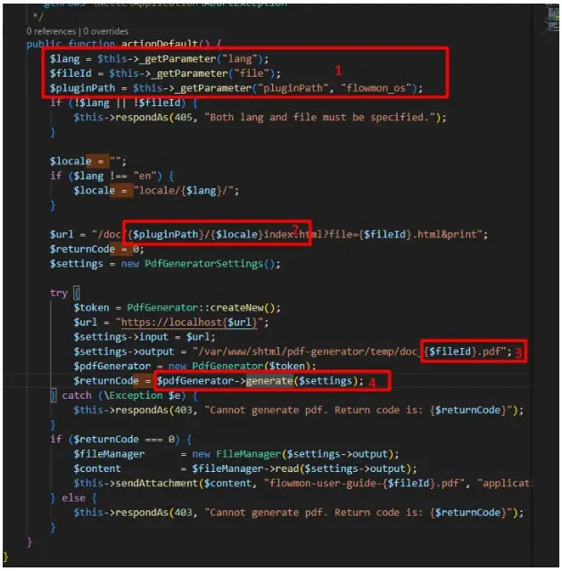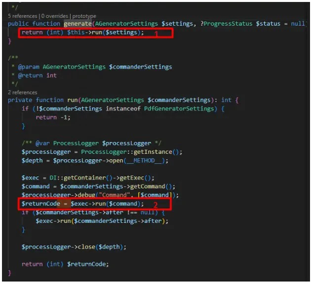 Further analysis revealed that the PdfGenerator.php contains a generate() method that makes a call to getExec.run() method, which has the privilege to execute system commands.