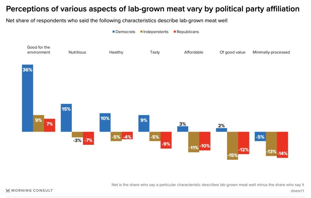 Democrats are far more likely to have a net-positive opinion on cultivated meat (the difference between the number of people who like a product versus those who don’t). For example, the net share of Democrats who say cultivated meat is good for the environment is 36, versus nine for independents and seven for Republicans.