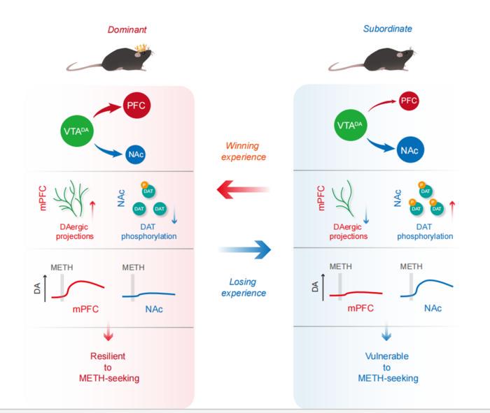 Keywords: dopamine pathways, addiction vulnerability, social rank, methamphetamine, mesolimbic circuit, mesocortical circuit, optogenetics, neural plasticity, addiction neuroscience, substance use disorder, executive control, reward system