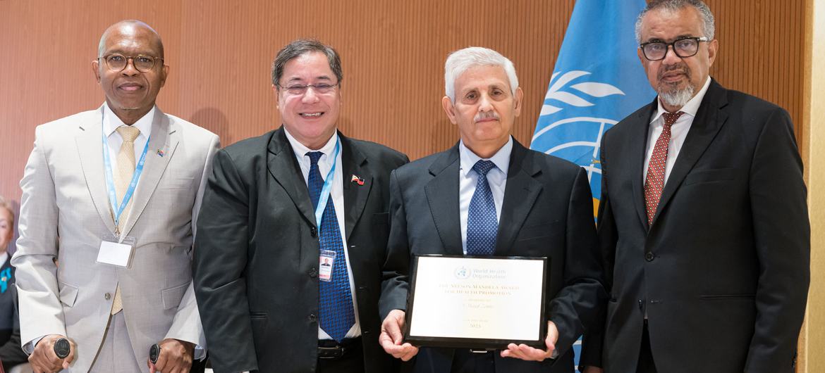 [Left to right] Ambassador Mxolisi Nkosi of South Africa; President of the 78th World Health Assembly Teodoro Herbosa; Dr. Majed Zemni of Tunisia, recipient of the 2025 Nelson Mandela Award for Health Promotion; and WHO Director-General Dr. Tedros Adhanom G