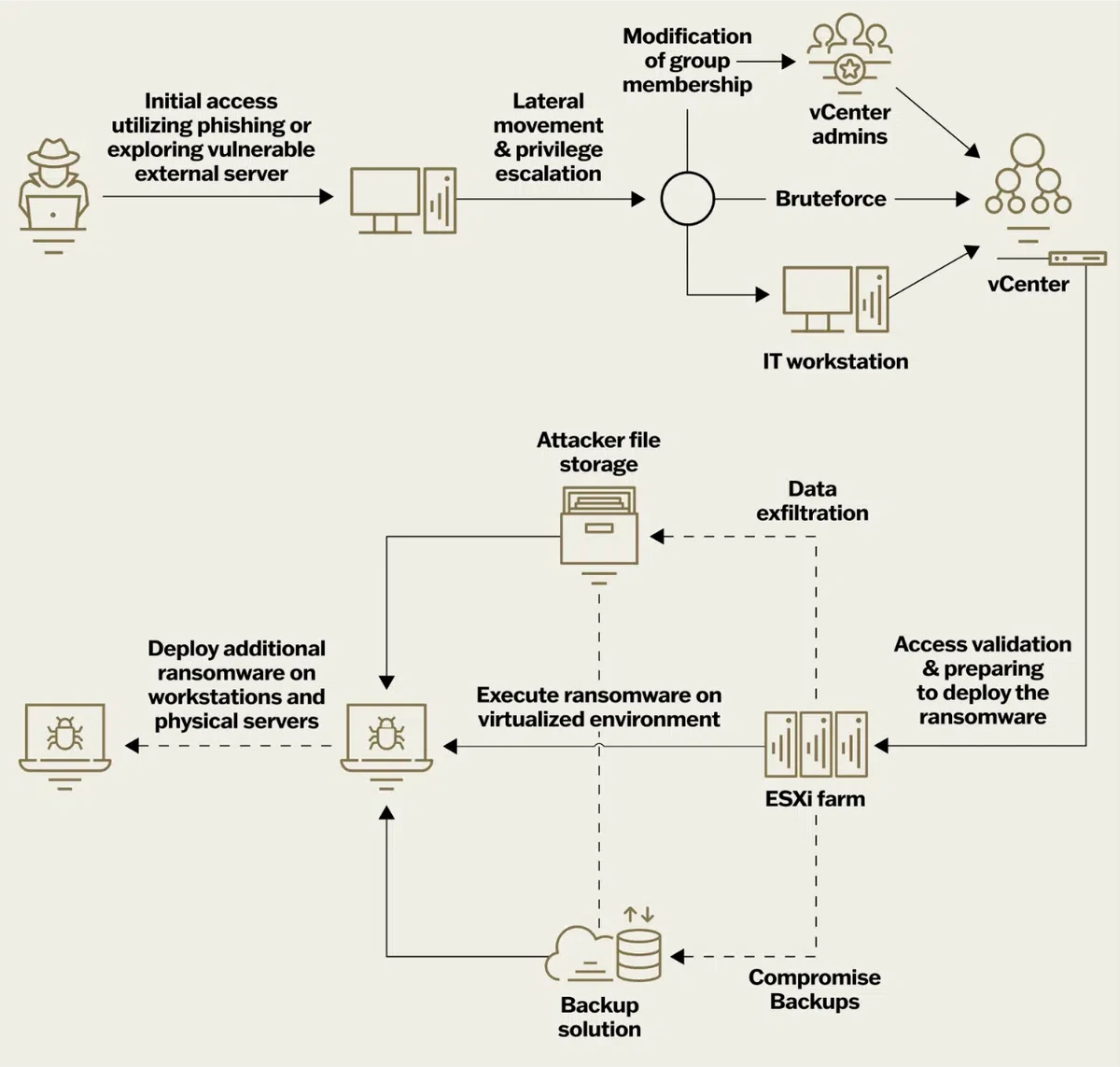 The modus operandi of these ransomware attacks involves gaining initial access to the virtualized environment, escalating privileges, and conducting extensive reconnaissance to identify valuable data.