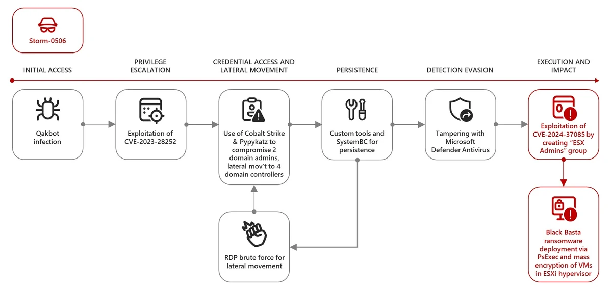 One particularly notable attack involved Storm-0506 deploying Black Basta ransomware. The attackers initially gained access through a Qakbot infection and exploited a Windows vulnerability (CVE-2023-28252) to elevate their privileges.