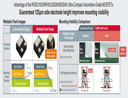 With conventional bottom electrode packages, the sides of the lead frame cannot be plated, making it difficult to conduct AOI to verify the solder height required for automotive applications. In contrast, ROHM’s new MOSFETs leverage proprietary Wettable Flank technology to ensure a breakthrough side electrode height of 125μm in the 1.0mm × 1.0mm size. This enables stable toe fillet formation even with bottom electrode packages, allowing the solder condition to be verified by AOI after mounting.
