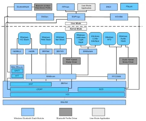 Windows Bluetooth Stack consists of multiple different drivers, services and user-mode libraries that are quite complex in their architecture.
