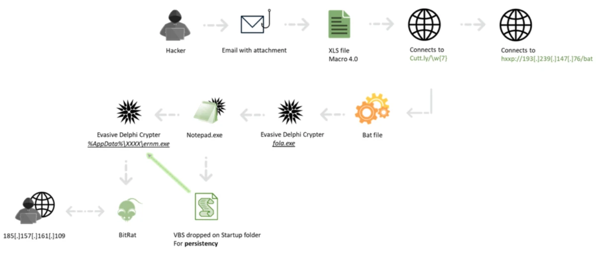 Malware infection begins when the dynamic content of an XLS document attached to a phishing email is enabled, and the XLM macro automatically starts downloading the command script for Windows.