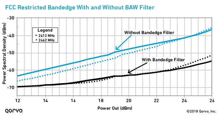 Wi-Fi designers normally must set the entire unit power to whatever the lowest bandedge-compliant power is for all channels. So, if the compliant channel at channel 1 is 15 dBm but channel 6 can achieve 23 dBm, the designer settles the entire power control scheme to 15 dBm. Using bandedge filtering allows designers to set the power scheme to much higher powers, thus making it possible to use fewer RF chains to achieve their goals.
