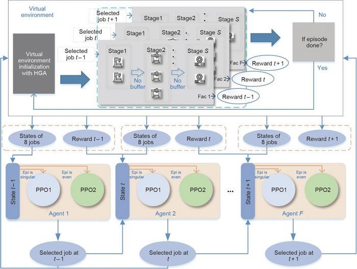 Keywords: Multi-agent training framework, Proximal Policy Optimization, Distributed Manufacturing, Hybrid Flow Shop Scheduling.