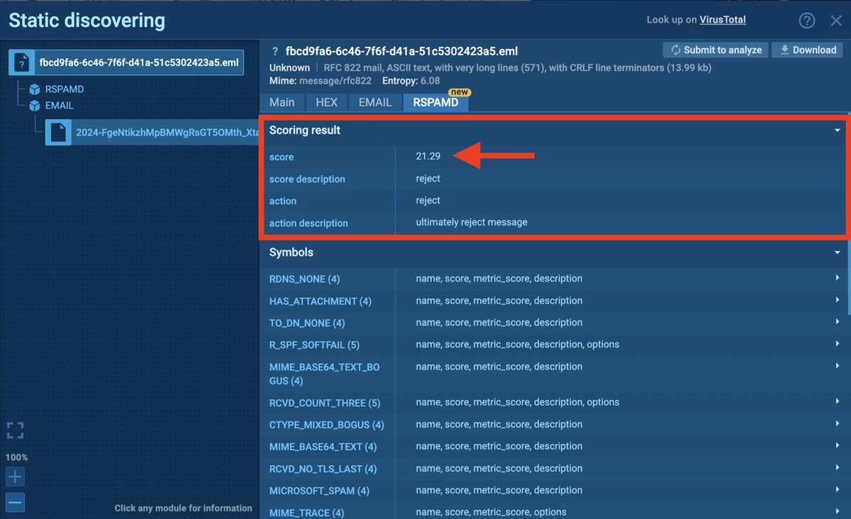 The RSPAMD module is seamlessly integrated into ANY.RUN’s Static Discovering feature. When users open an email file in Static Discovering, the RSPAMD tab provides a detailed breakdown of the email’s information, including its spam score, headers, and RSPAMD symbols.