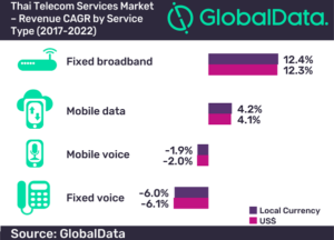 Thailand’s telecom service revenues are set to grow at a CAGR of 2.7% over the period 2017-22 driven by increased mobile and fixed broadband adoption, according to GlobalData, a leading data and analytics company. At the same time, traditional fixed and mobile voice revenues will decline due to price reductions and a shift towards IP/OTT-based communications.