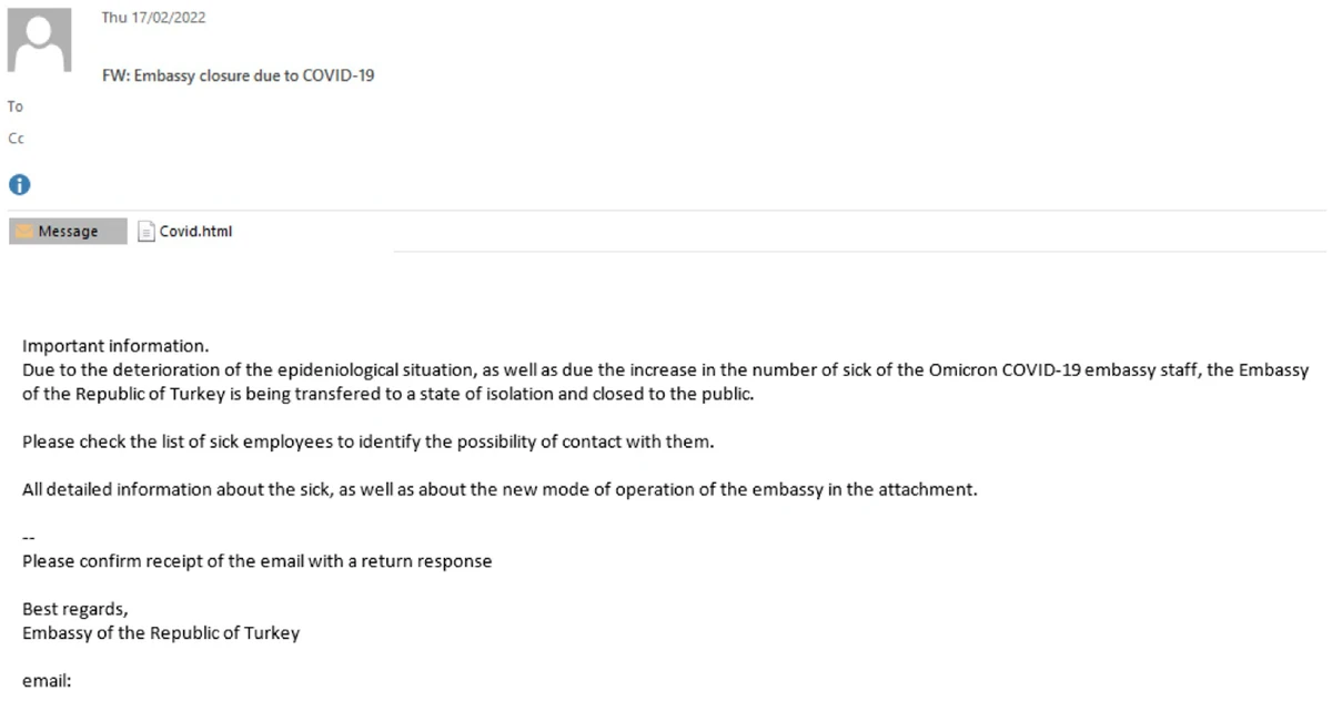 It is believed that APT29 sent spear-phishing emails disguised as embassy administrative updates in order to gain access to the victim’s environment. These phishing emails used emails from other diplomatic entities that were legitimate, but had been compromised by malicious hackers.