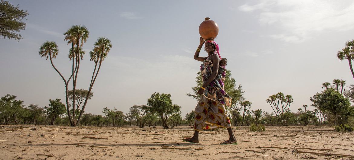 A woman carries a baby and a water container as she walks across arid land in Niger.