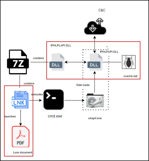 - DLL Sideloading: The legitimate wksprt.exe loads a malicious DLL named IPHLPAPI.dll.
