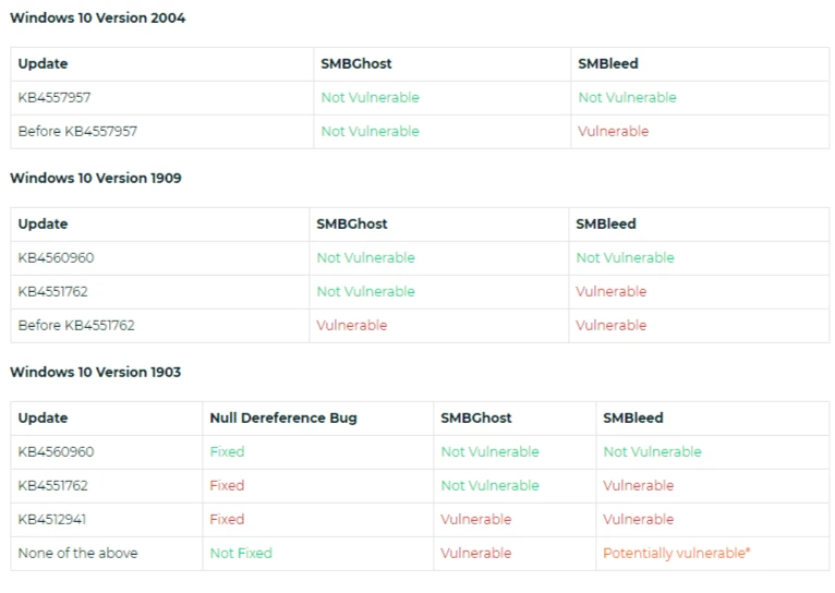 Microsoft released security updates to patch SMBGhost, applicable for Windows 10 (versions 1903 and 1909) and Windows Server (1903 and 1909 – Server Core installation).