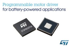 STMicroelectronics’ STSPIN32F0A programmable motor controller contains fully integrated gate drivers for three external MOSFET half-bridges, an STM32F0 microcontroller (MCU), as well as a 3.3V DC/DC switching converter plus a 12V LDO, giving designers flexible motor-control options in a lightweight and compact 7mm x 7mm outline. The 48MHz microcontroller, with 32Kbyte on-chip Flash, can run motor control algorithms such as 6-step sensorless, field-oriented control or position-sensed control, as well as the user application.