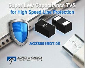 Alpha and Omega Semiconductor Limited (AOS) today announced the release of AOZ8661BDT-05 a transient voltage suppressor (TVS) for high-speed line protection using the latest Super Low Cap TVS platform. This new device is ideal for USB Type-C applications such as notebooks and mobile devices.