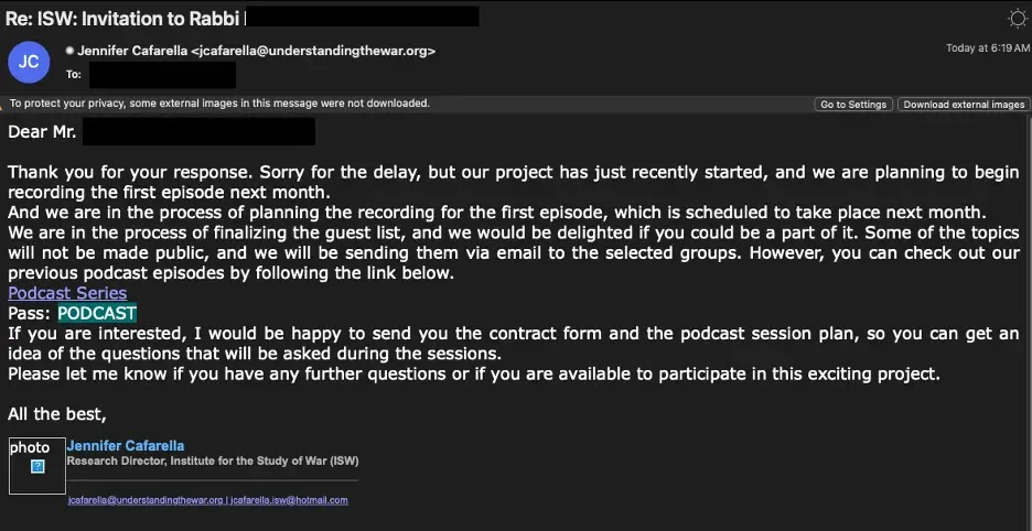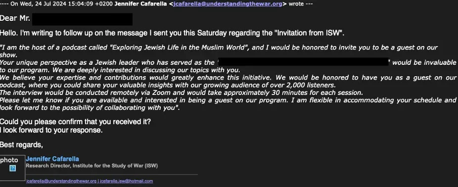A cyber threat group launched a phishing campaign in February 2024 targeting a religious figure by impersonating the Institute for the Study of War (ISW) via a spoofed domain and sending a fake podcast invitation to both the target’s work and personal email addresses.