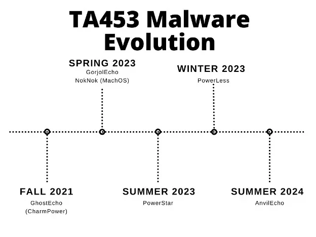TA453 continues to leverage PowerShell backdoors, evolving its tactics to evade detection and featuring a monolithic PowerShell script dubbed AnvilEcho, consolidating previously separate modules for streamlined deployment.