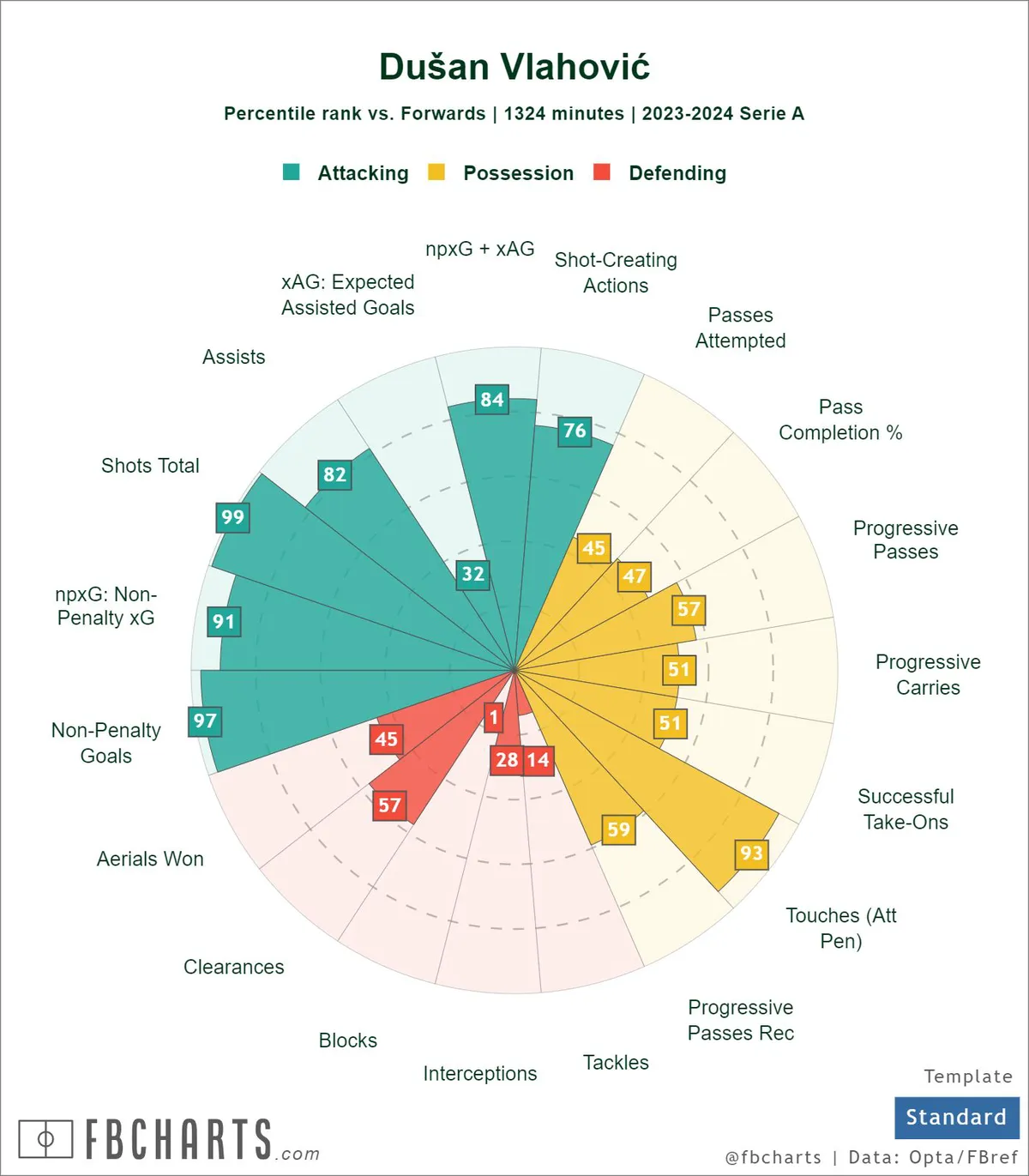 In comparison to Lautaro, Vlahovic does play less of a role in build-up play, averaging just 1.84 progressive passes per 90, and he’s also less involved in defensive play, mostly remaining isolated at the top of the pitch.