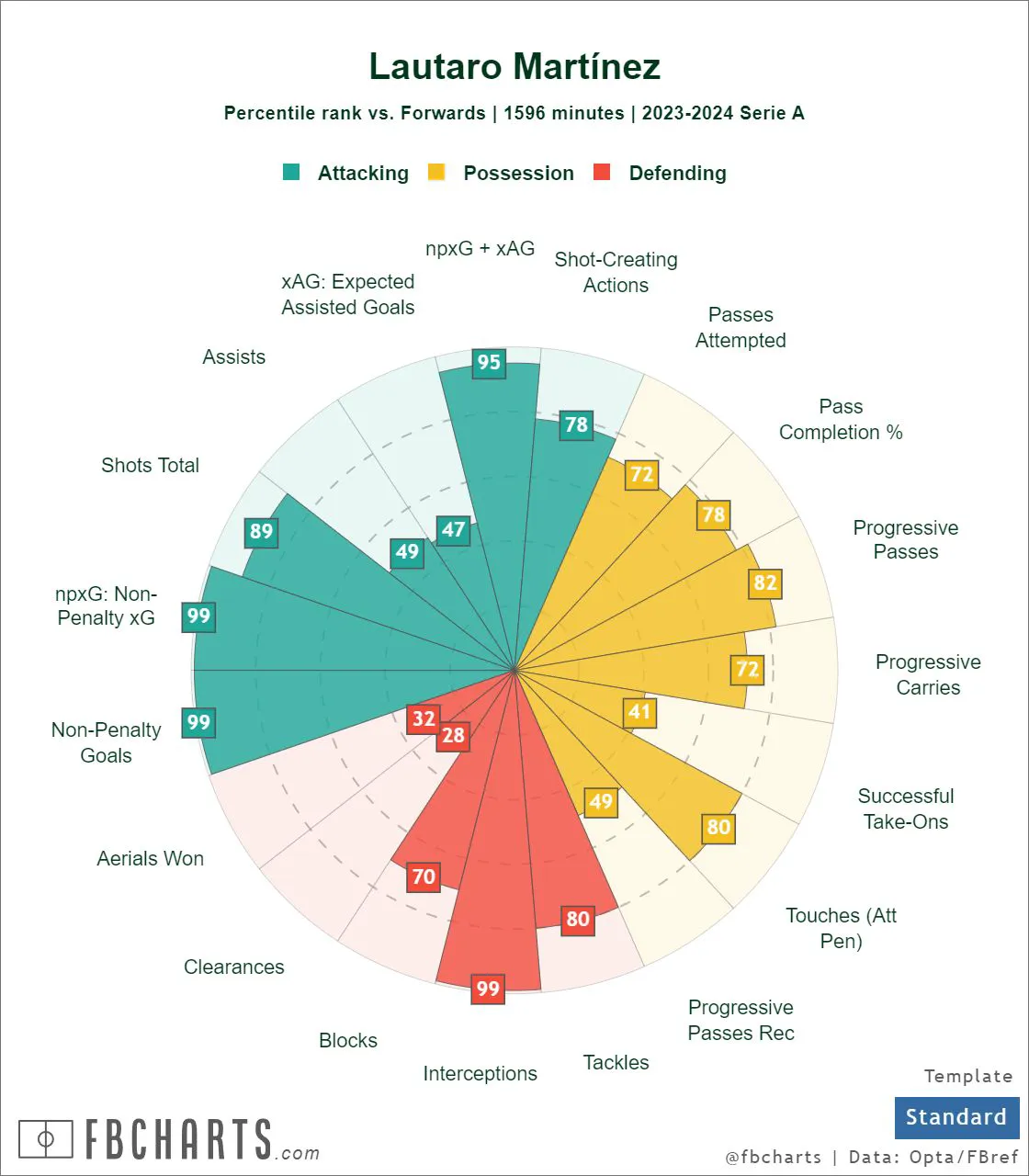 The underlying numbers prove Lautaro to be one of the most preeminent centre forwards in world football this season, standing out in all the areas where it counts. This term, the 26-year-old has averaged 0.96 goals per 90 minutes, 3.55 shots per 90, 2.88 progressive passes per 90 and 0.58 xG per 90.