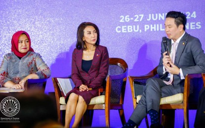 FOOD TOURISM. Thailand Vice Minister for Tourism and Sports Jakkaphon Tangsutthitham (right) during the ministerial dialogue of the first United Nations (UN) Tourism Regional Forum on Gastronomy Tourism for Asia and the Pacific in Cebu on Wednesday (June 26, 2024). Also in photo (from left) are Martini Paham, Indonesian Deputy Minister for Resources and Institutions at the Ministry of Tourism and Creative Economy, and Philippine Tourism Secretary Christina Garcia Frasco. (Photo courtesy of DOT)