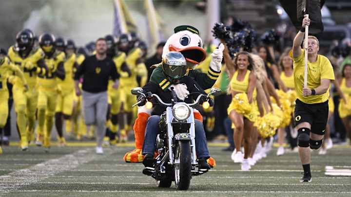 I just love the visual of a human sized duck riding on the back of a Harley-Davidson motorcycle. The tradition began in 1997 and the idea came from the Minnesota Vikings. There have been four drivers of the motorcycle including Doug Koke who recently retired after 23 years of leading the Ducks onto the field.