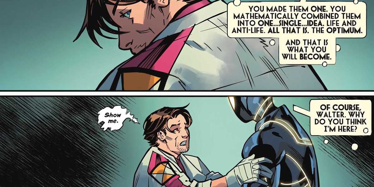 The Optimum tells Prof that he’s a result of Haley’s greatest success: Uniting the Life and Anti-Life Equations into one formula. The Optimum tells him that though Prof will eventually merge the two equations and be endowed with unimaginable power, it may be too late as the DC Universe is rapidly approaching its end. The only way Prof can prevent that future and unite Darkeseid’s Anti-Life Equation with the Life Equation earlier is by using whatever it is the Choi and Palmer are working on in the Atom Project.