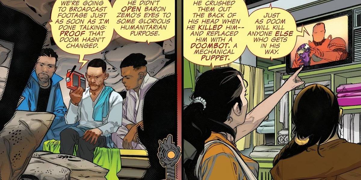 While Doctor Doom’s hatred of Nazis and HYDRA is justifiable, his own actions in One World Under Doom #1 are not. Doom decries Zemo and the Red Skull for being fascists, but seizing control of a planet and stomping out all forms of dissent falls under the fascist umbrella as well. Doom is imposing his absolute will on Earth, ruthlessly killing those who disagree with him: in the first issue’s opening pages, Doom detects an uprising and immediately dispatches Doombots to quell it. While fans do not know how Doom killed the Red Skull, he crushed Zemo’s head.