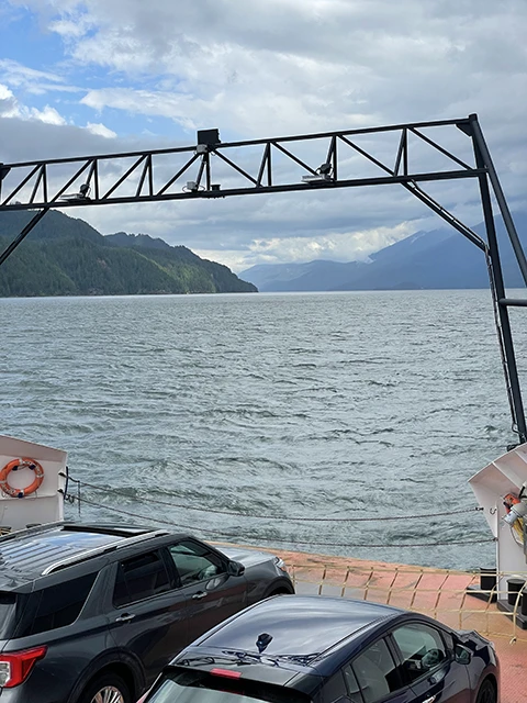 We woke the morning of our last day and departed from the official West Koot Route for our alternate course home through the Idaho Panhandle. In the community of Balfour, we lined up early at the Kootenay Lake Ferry for the free, 35-minute boat ride (the longest free ferry ride in the world). Our destination was the artisan community of Crawford Bay, BC, and while we waited to load the boat we watched bubbles whimsically floating past our windshield from a tie-died shirt and gift shop as ferry riders milled about engaged in casual conversation with just about everybody they encountered out of a vehicle or with an open window. Once we were on the ferry, we visited the snack stand for our ever-hungry child and wandered around the deck to watch the wind-blown water—which felt as wild and vast as an ocean crossing—catch sunbursts through clouds that lit up the endless mountain views.