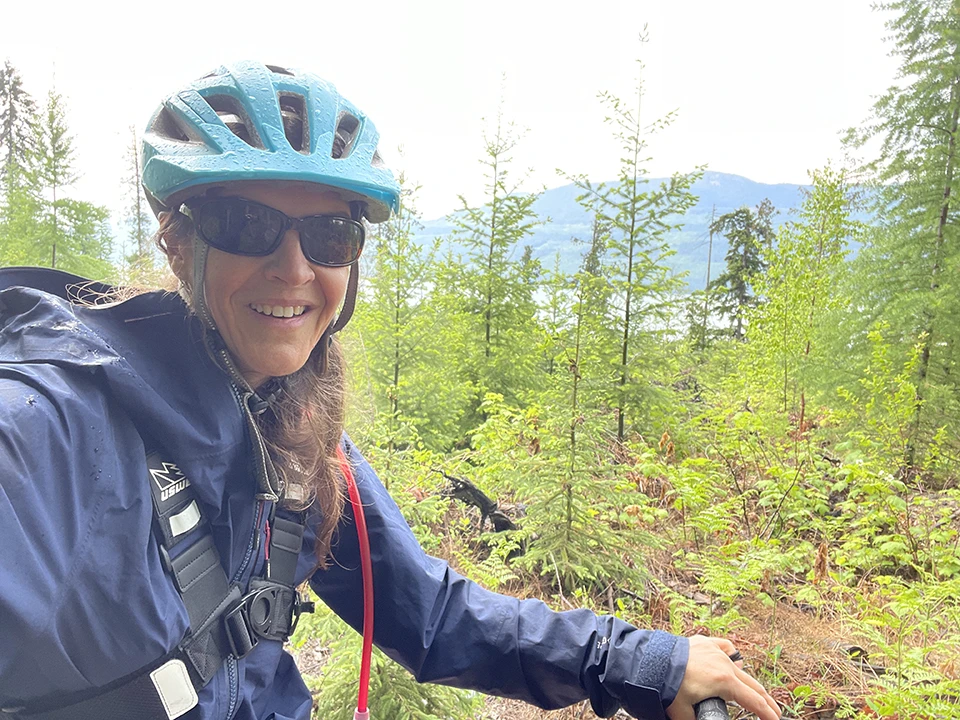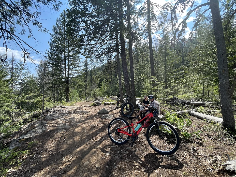 The two-plus hour drive north went fast, and the border crossing, with a passport or enhanced WA State drivers’ license, is quick and easy. Ten minutes later, we arrived in Rossland and stopped in at Revolution Cycles for a free map and advice on which trails would be best for our hill- and rock-hating 8-year-old. Driving the few blocks from town to the Centennial Trailhead, we passed a dozen people on bikes—mountain bikers heading to the trails and multiple parents on e-bikes pulling trailers with kids. At the trailhead parking lot, we opened the van door and the lush smells of spring mountain air rushed in. Friendly chatter from the handful of other people heading out for a hike or bike ride mixed with unseen birds chirping away in the trees drifted around us as we unloaded bikes and geared up. The first layers of all of that work tension began to soften ever so slightly.