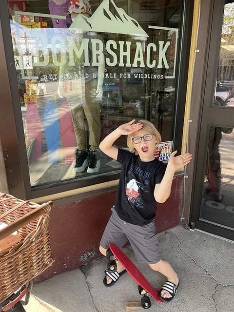 That night, back at our hotel, I indeed cracked open the laptop to tap away some worries for an hour or two before calling it a night, but my heart wasn’t in it. After a quick breakfast the next morning, we beelined it to the skate park, which has plenty of eye candy for non-skaters in the form of murals, sculptures, and other art. We watched Remi roll around the many features, mostly riding his new skateboard on his belly, while Shallan and I sipped coffee in the morning sunshine. We had planned to hike up KC Ridge that morning for a view of Rossland, but if there’s one thing we have learned about traveling with children, it’s to be flexible and slow down. With morning edging toward afternoon, we finally loaded up and hit the road to Castlegar.