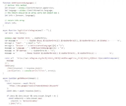 Utilizes helper functions to gather visitor information and potentially send it to a specific URL, like ‘getVisitorIP’ to retrieve IP details, while `logVisitorToTelegram` asynchronously logs data to a Telegram chat. `getMXRecord` fetches email server information.