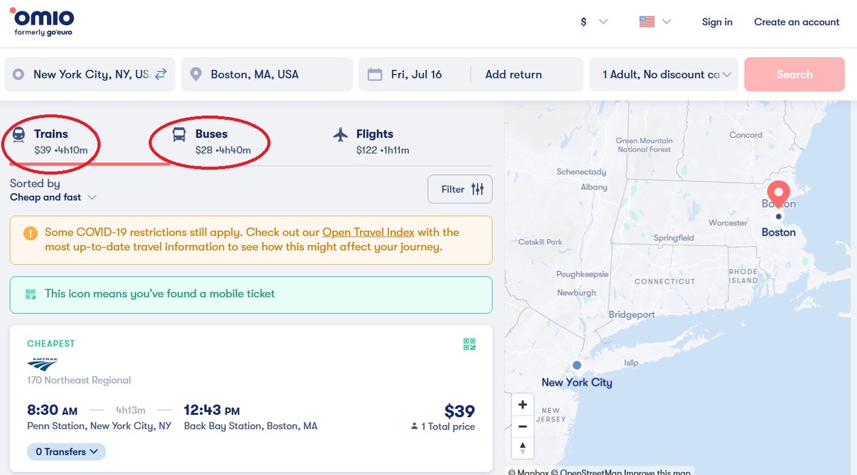 In the example above for a trip from New York to Boston, you see that a bus ticket is $11 cheaper than a train ticket. The train ride is only about thirty minutes shorter, so you’ll have to decide if you want to save money and take the bus, or if you’ll opt for the train (which I’d recommend since buses often get stuck in traffic.)