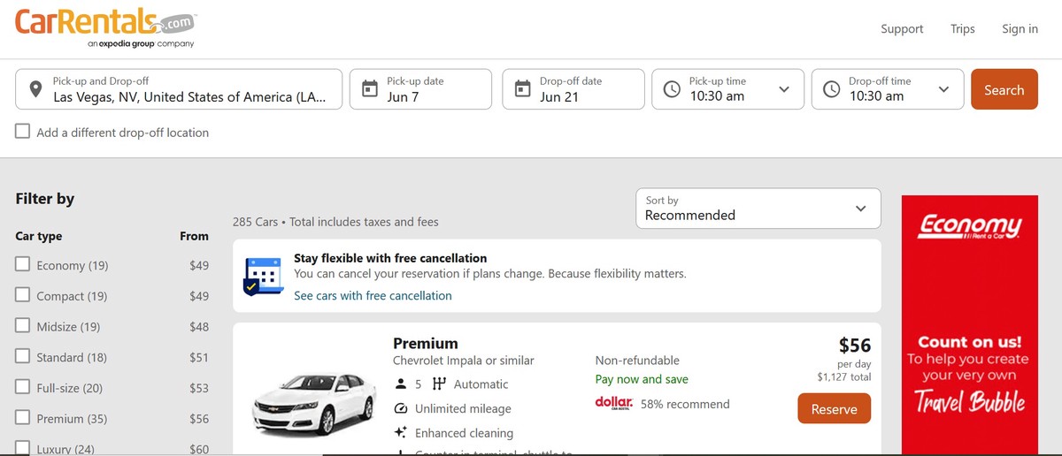 As with all other transportation options, I recommend comparing rates for rental cars through an online travel aggregator. Priceline is a popular comparison website, as is Carrentals.com, an Expedia-owned rental car aggregator. Be aware that if you see a deal that seems too good to be true – it probably is.