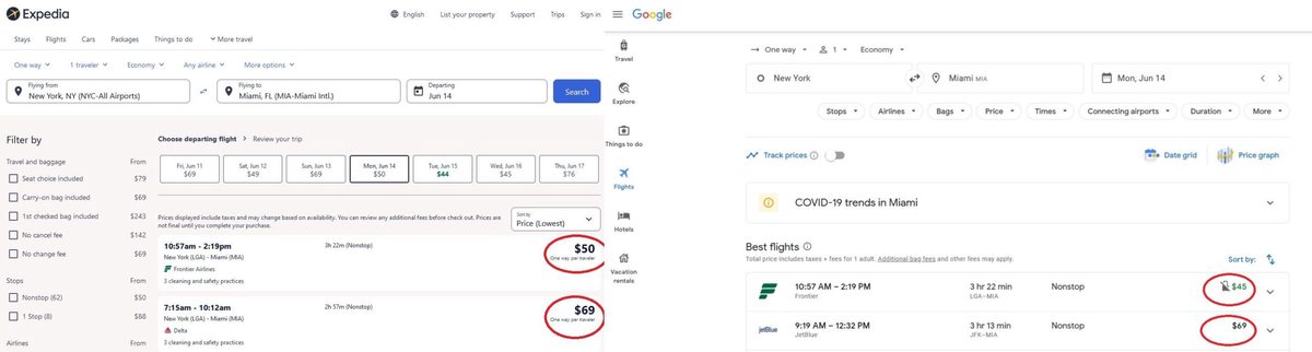 In the example below, a flight from New York City to Miami, you can see that all three websites found the same Frontier flight as the cheapest option, however, the second cheapest option is a different option on each website.