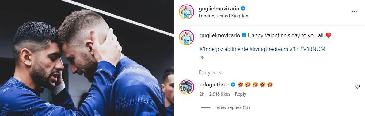 Italy international Destiny Udogie enjoyed Guglielmo Vicario’s Valentine’s Day message on Instagram where the goalkeeper seemed about to kiss Tottenham centre-back Cristian Romero, a former Atalanta and Genoa defender.