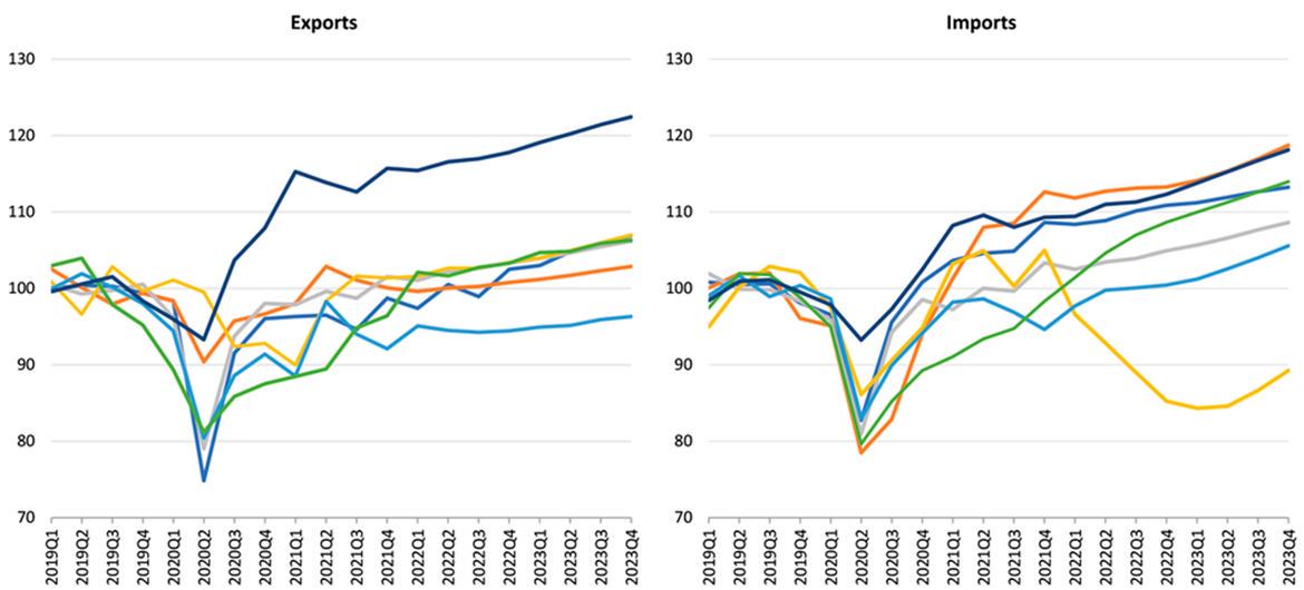 Merchandise exports and imports by region, 2019Q1-2023Q4. Volume index, 2019=100