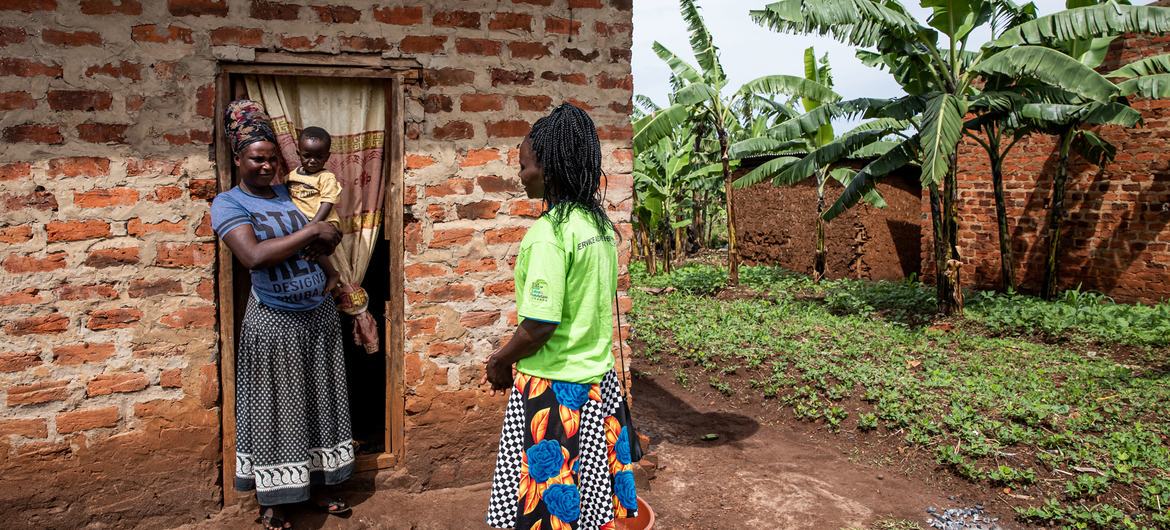 Phiona who works as a Peer Mother at the Rugaga IV Health Centre in Uganda, visits a client and her son at their home who was provided training and support to deliver HIV-free babies.