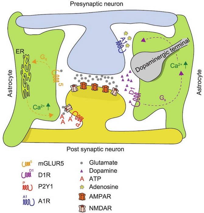 On the other hand, dopamine D1 receptors are widespread in various brain regions, particularly the nucleus accumbens (NAc), which is integral to the brain’s reward circuitry. D1R signaling in NAc astrocytes is characterized by its complexity, illustrating the multifaceted nature of astrocytic involvement in reward and addiction pathways. The activation of astrocytic D1R leads to a signaling cascade that enhances inositol trisphosphate (IP3) signaling, which subsequently promotes the release of adenosine. This release has inhibitory effects on glutamatergic signaling, resulting in a reduced excitatory drive to medium spiny neurons in the NAc, which are crucial for mediating the reward and reinforcement processes.