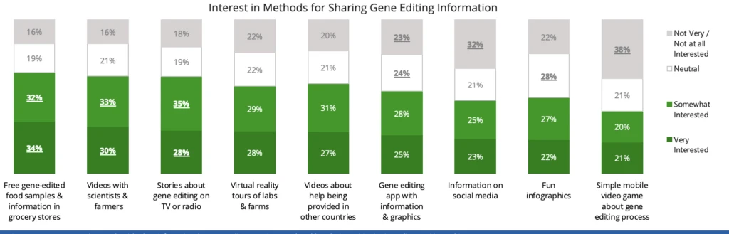 Consumers are also interested in getting information about gene editing through videos, TV and radio where they can watch and/or listen to stories from scientists and farmers who have expertise and experience with gene-edited products. Additionally, 66 percent liked the idea of getting free samples of gene-edited foods in grocery stores.
