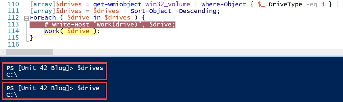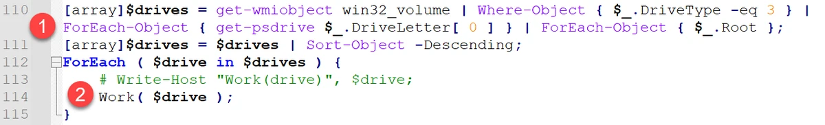 - Iterates through the list of drives on the host ($drive) and passes every drive to the Work() function.