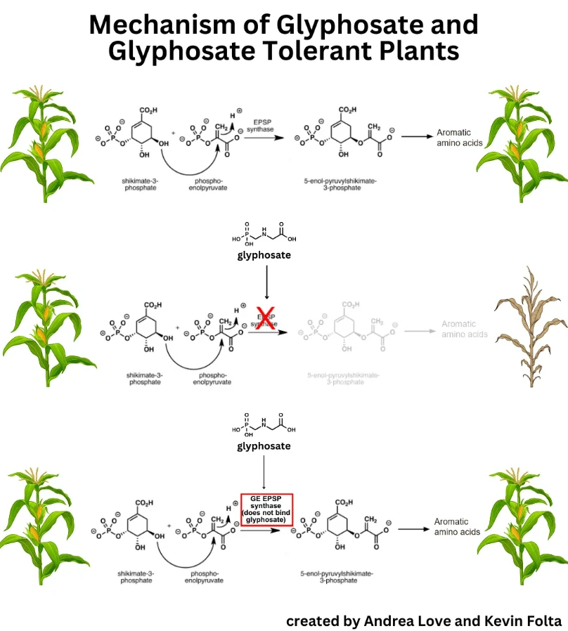 Glyphosate kills plants by interfering with 5-enolpyruvylshikimate-3-phosphate synthase (EPSPS), an enzyme essential for the production of key amino acids. If plants can’t synthesize those amino acids, the plant can’t make proteins (many of those are structural), and the plant wilts and dies. All plants have this biochemical pathway, which is why glyphosate is a broad spectrum herbicide.