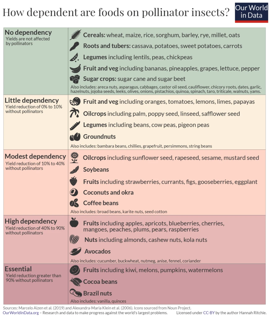 Among the other crops that use animal pollinators, there are varying degrees of how much the plants need them. Only a very small portion absolutely require animal pollination, while many more are “highly dependent” on it. Production of the remaining crops would likely continue without bees with only slightly lower yields.