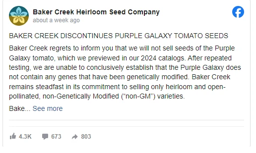 Baker Creek Heirloom Seed Company had an intriguing offer in its 2024 catalog: a tomato seed it called Purple Galaxy. However, what the Missouri-based non-GMO seed supplier didn’t seem to realize is that the Purple Galaxy [had a similar name as] the purple genetically engineered tomato variety created by Norfolk Healthy Produce.