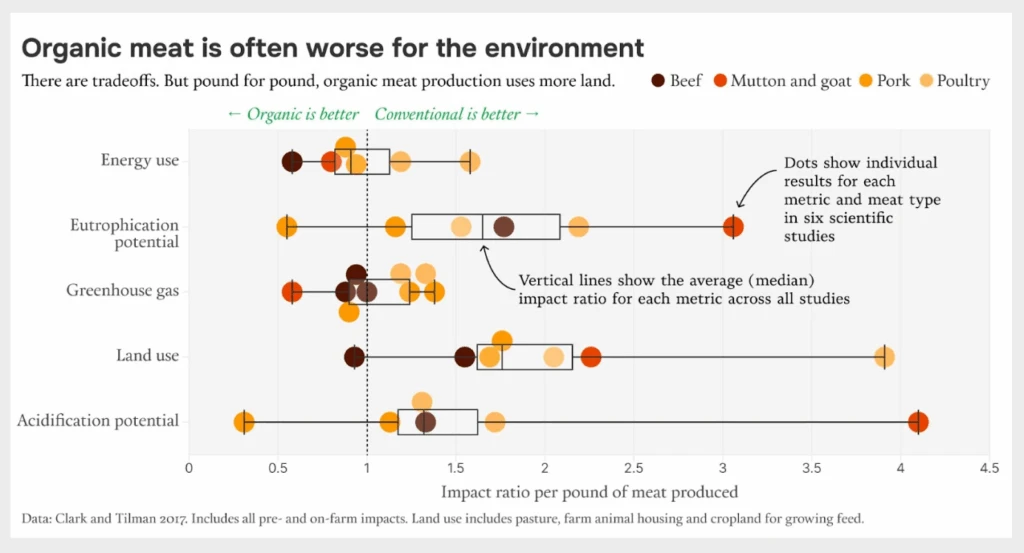 When it comes to the environment, organic food isn’t necessarily better and can even be worse, in part because it requires more land to raise animals and grow their feed. In other words, that additional land means farm animals get a little more living space under U.S. organic rules. But unfortunately, unless we cut back on how much meat we eat, farming with even more land comes at a steep climate cost (and we’re already way over budget).