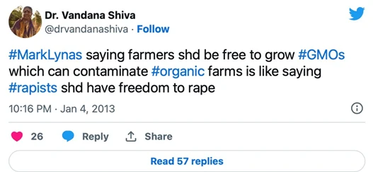 4. Shiva is not interested in civil discourse, consistently resorting to attacks and hyperbole. One of many examples is this tweet: ”Saying farmers should be free to grow GMOs which can contaminate organic farms is like saying rapists should have freedom to rape”.